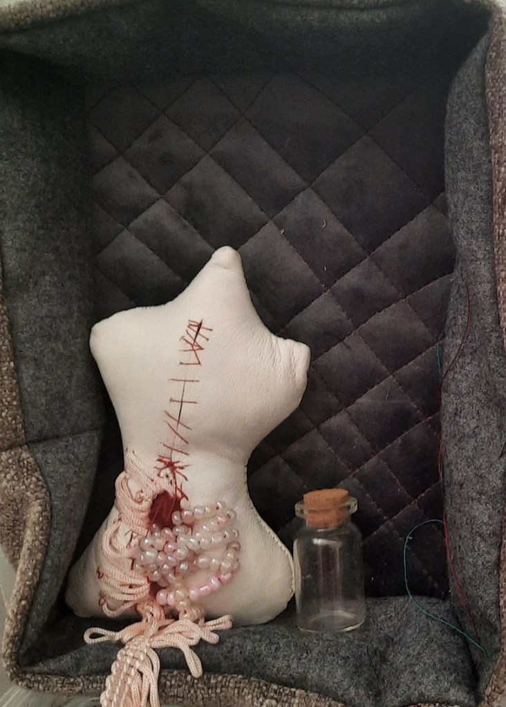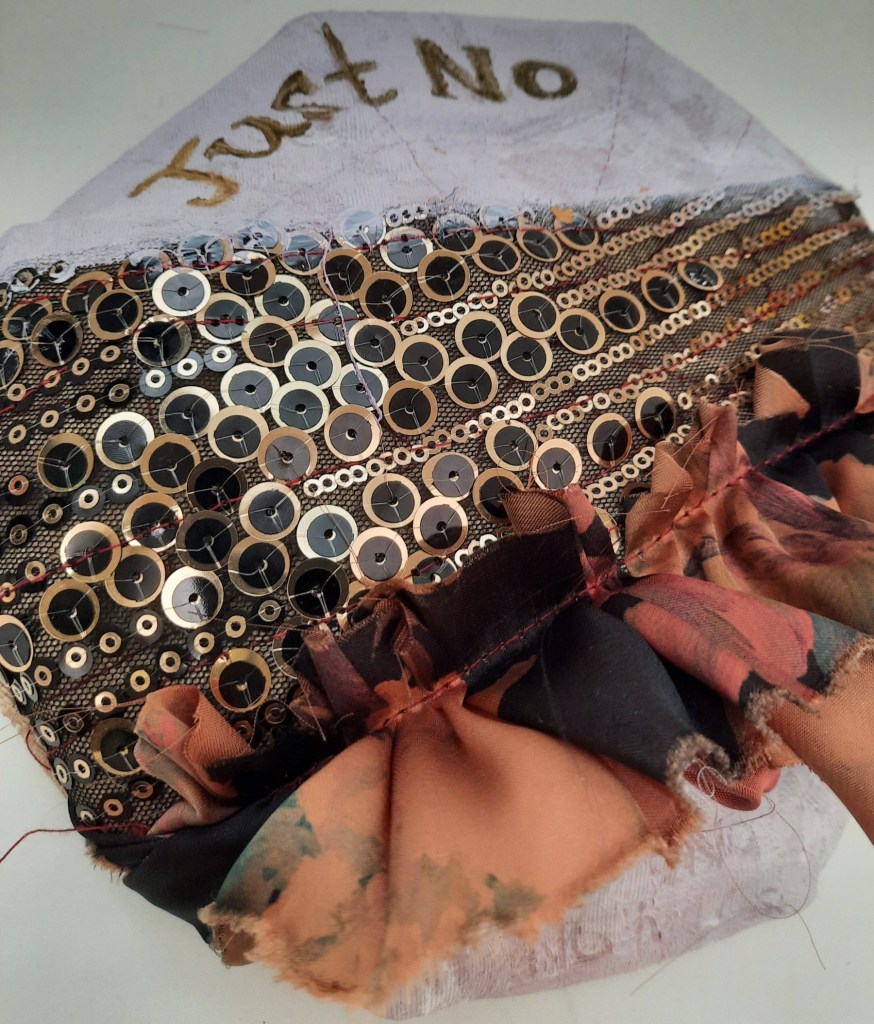 I like to work in textiles, especially wool, silk and sequins. I use embroidery, felt making, soft sculpture, clay, print and foraged things to make objects which reflect memories, personal history and lost skills.