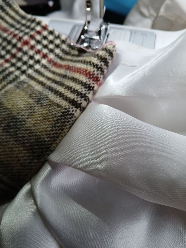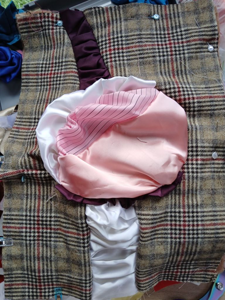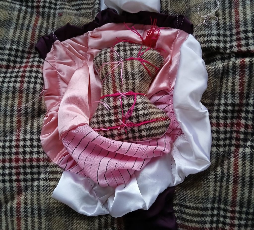 Tweed and lining, satin, dresses cut out and half sewn, marked up and tacked.