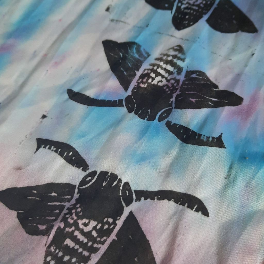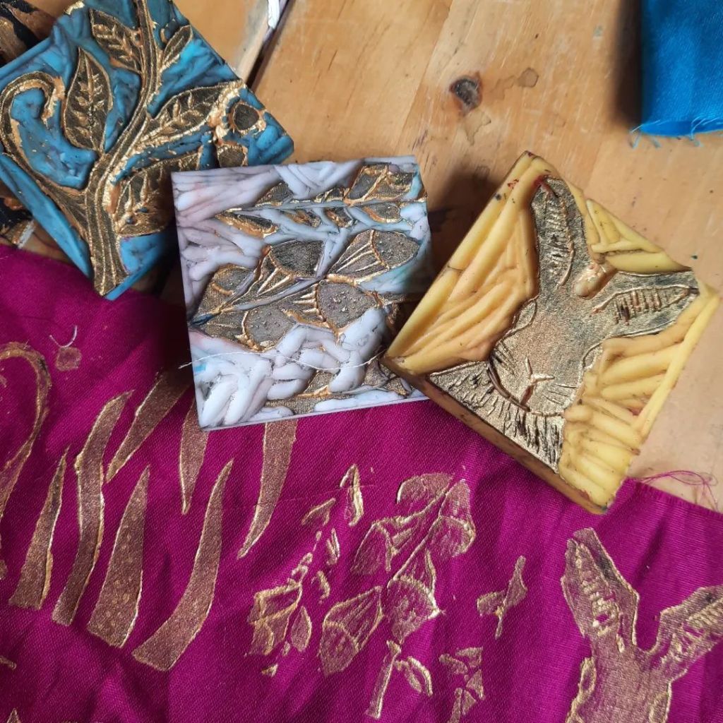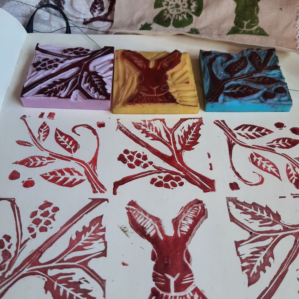 Above: Prints using linocut and hand made print blocks
